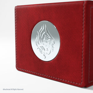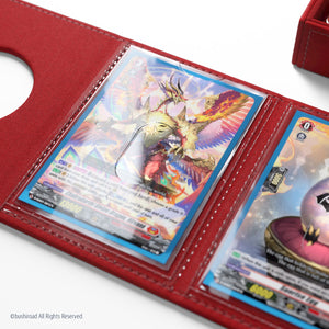 Coming in 6 different colors, all six different nations are represented with their matching color and the innovative metal-plated lock with the nation’s symbol at the front. The Cardfight!! Vanguard Nation’s Vault is perfectly sized to hold a full deck of up to 50 cards, even double-sleeved. In addition, there are 2 protected pockets to present and safely store up to 4 special sleeved cards.